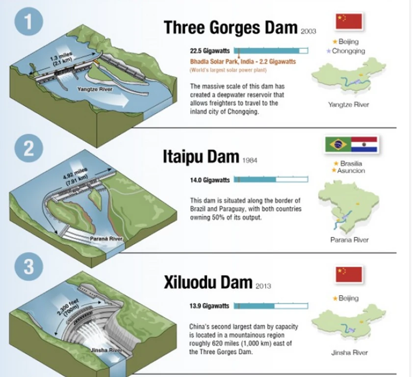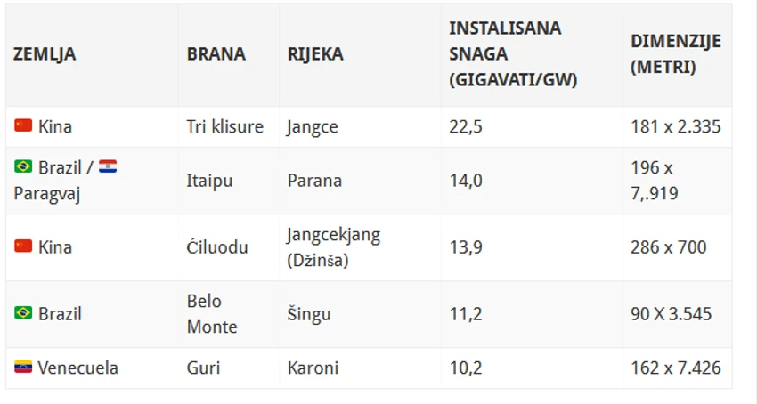 Lista najvećih hidroelektrana na svetu Izvor: blic 2022 Dodatak: U medjuvremenu je napravljena hidroelektrana Baihetan u Kini koja zauzima drugo mesto sa 16000MW. Da li znate da je hidroelektrična energija najveći svetski izvor obnovljive energije? Prema nedavnim podacima Međunarodne agencije za obnovljivu energiju (IRENA), ona čini 40 odsto ukupnih kapaciteta, i nalazi se ispred solarne (28%) i energije vetra (27%). U narednoj infografici prikazano je pet najvećih hidroelektrana na svetu, rangiranih prema njihovoj maksimalnoj snazi i podacima iz 2021. godine. Instalisana snaga je maksimalna količina energije koju postrojenje može da proizvede pod punim opterećenjem. ![]() ![]() Ovu vrstu energije proizvode hidroelektrane, koje su u suštini velike brane koje koriste tok vode za okretanje turbina. One takođe mogu da imaju sekundarne funkcije kao što su praćenje protoka i kontrola mogućnosti od poplava. ![]() Na vrhu liste je kineska brana "Tri klisure", otvorena 2003. godina, koja ima instalisanu snagu od 22,5 gigavata (GW), što je skoro dvostruko više od brane "Itaipu" koja se nalazi na drugom mestu liste. No, kada je reč o godišnjoj proizvodnji, brana "Itaipu" proizvodi približno istu količinu električne energije. To je zato što reka Parana ima malu sezonsku varijaciju, što znači da se brzina protoka vrlo malo menja tokom godine. S druge strane, reka Jangce ima značajan pad protoka nekoliko meseci u godini. Brana "Tri klisure" Brana "Tri klisure" je inženjersko čudo, čija je izgradnja koštala više od 32 milijarde dolara. Da bi shvatili njenu veličinu, treba uzeti u obzir sedeće činjenice: Akumulacija Tri klisure (koja snabdijeva branu) sadrži 39 triliona kolograma vode, odnosno 42 milijarde tona Akumulacija se prostire na 1.045 kvadratnih kilometara Masa ovog rezervoara je dovoljno velika da uspori Zemljinu rotaciju za 0,06 mikrosekundi Naravno, svaka ovako velika infrastruktura koju je napravio čovek sigurno će imati značajan uticaj na životnu sredinu. U studiji iz 2010. godine utvrđeno je da je brana izazvala više od 3.000 zemljotresa i klizišta od 2003. godine. Posledice gradnje brana Iako hidroenergija može biti isplativa, postoji opravdana zabrinutosti oko njene dugoročne održivosti. Za početak, brane hidroelektrana zahtevaju velike uzvodne rezervoare kako bi se osigurao kontinuitet u snabdevanju vodom. Plavljavanje novih područja zemlje može poremetiti staništa divljih životinja, pogoršati kvalitet vode, pa čak i uzrokovati prirodne katastrofe poput zemljotresa. Brane takođe mogu da poremete prirodni tok reka. Neke studije su otkrile da milioni ljudi koji žive nizvodno od velikih brana konstatno brinu zbog pristupa hrani i poplava. - Dok su koristi od hidroelektrana uglavnom dobijali urbani centri ili poljoprivredna industrija, stanovništvo koje zavisi od reke nizvodno od brana doživelo je značajne negativne promene u životnog standarda - stav je naučnika. Možda najveći rizik za hidroenergiju predstavljaju same klimatske promjene. Na primer, zbog sve većih suša, hidroelektrane na mestima poput Kalifornije postaju znatno manje ekonomične. |