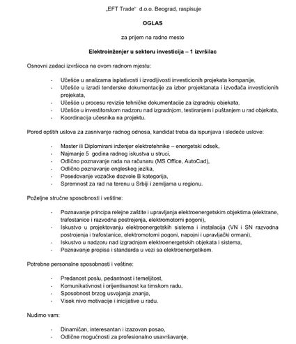 | Ako vam je potreban elektroinženjer sa smera energetika, oglas za posao možete postaviti ovde. |