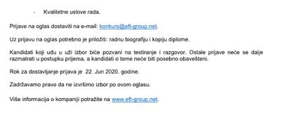 22.6.2020 - EFT Trade Beograd - Elektroinzenjer u sektoru investicija EFT Trade Beograd raspisuje oglas za prijem na radno mesto: Elektroinzenjer u sektoru investicija Prijave na oglas dostaviti na email: konkurs@eft-group.net Uz prijavu na oglas potrebno priloziti radnu biografiju i kopiju diplome. Rok za dostavljanje prijava je 22 Jun 2020. godine. ![]()