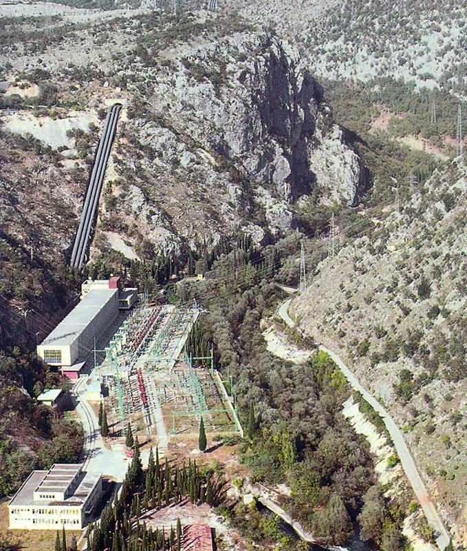 Hidroelektrana Perućica HE „Perućica“ je najstarija velika hidroelektrana u Crnoj Gori, puštena u pogon 1960. godine. Nazvana je po vrelu Perućica, koje izvire u blizini hidroelektrane. Nalazi se na teritoriji opštine Nikšić, u sjevernom dijelu Bjelopavlićke ravnice, dok su male hidroelektrane smještene na teritorijama opština Kolašin, Podgorica, Cetinje i Šavnik. Njena instalisana snaga je 307 MW, a moguća godišnja proizvodnja oko 1.300 GWh. Korisna akumulacija je 225 miliona metara kubnih vode. Za proizvodnju električne energije HE "Perućica" koristi vode sliva rijeke Gornja Zeta, odnosno vode koje dotiču u Nikšićko polje i to pri povoljnom padu na kratkom rastojanju između Nikšićkog polja i Bjelopavlićke ravnice. Slivno područje HE „Perućica“ iznosi 850 km². U Mašinskoj zgradi HE „Perućica“, ugrađeno je 7 dvojnih turbina tipa „Pelton“ sa generatorima horizontalnih osobina ukupne instalisane snage od 307 MW. Pet agregata imaju instalisanu snagu od po 40 MVA i dva od po 65 MVA. Planirano je da se ugradi i osmi agregat snage 65 MVA za koga su izgrađeni svi dovodni i odvodni organi, pomoćni i zajednički pogoni i određeno mjesto za ugradnju u mašinskoj zgradi. Rekordne 2010. godine HE "Perućica" proizvela je 1434,9 GWh. ![]() ![]() ![]() ![]() |